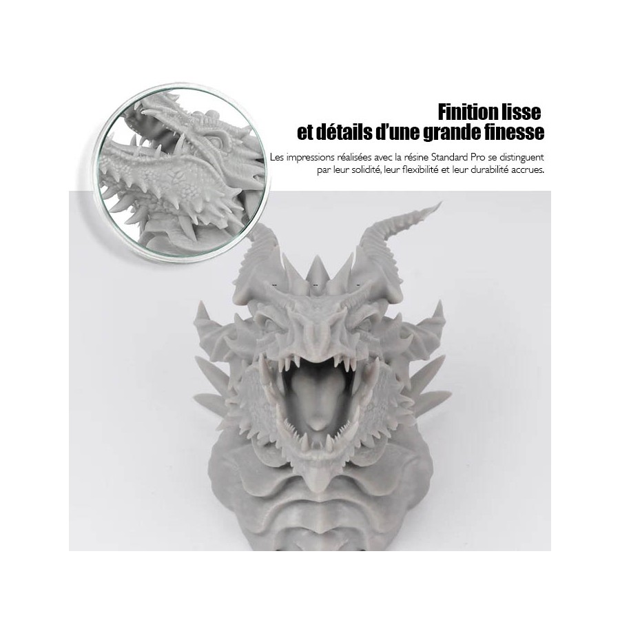 Sa surface lisse et son temps de durcissement rapide facilitent le post-traitement, tandis que sa version grise neutre capture parfaitement les petits détails et constitue une base idéale pour la peinture.
