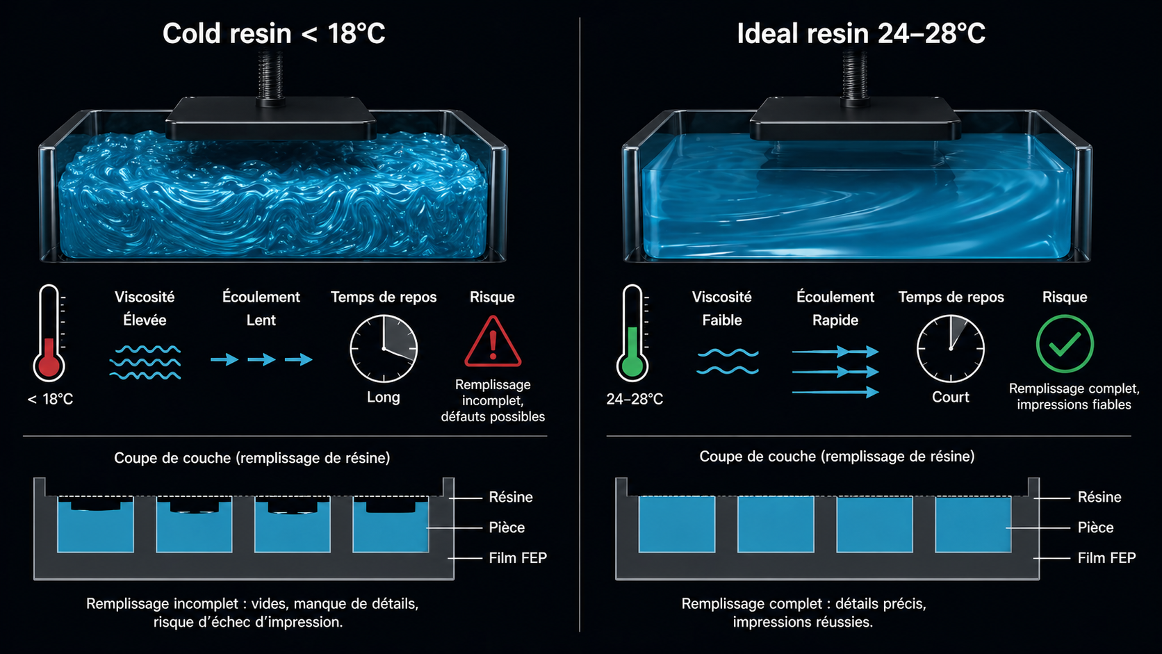 Quand la résine est froide, elle est plus visqueuse. Après que le plateau s'est décollé du FEP pour remonter entre deux couches, un film de résine fraîche doit venir remplir l'espace laissé avant la prochaine exposition. Si la résine est épaisse, ce remplissage est plus lent. Si votre "rest time" (temps de repos entre couches) n'est pas augmenté en conséquence, vous exposez une couche partiellement vide, ce qui donne des inclusions, des délaminages ou des couches mal définies.