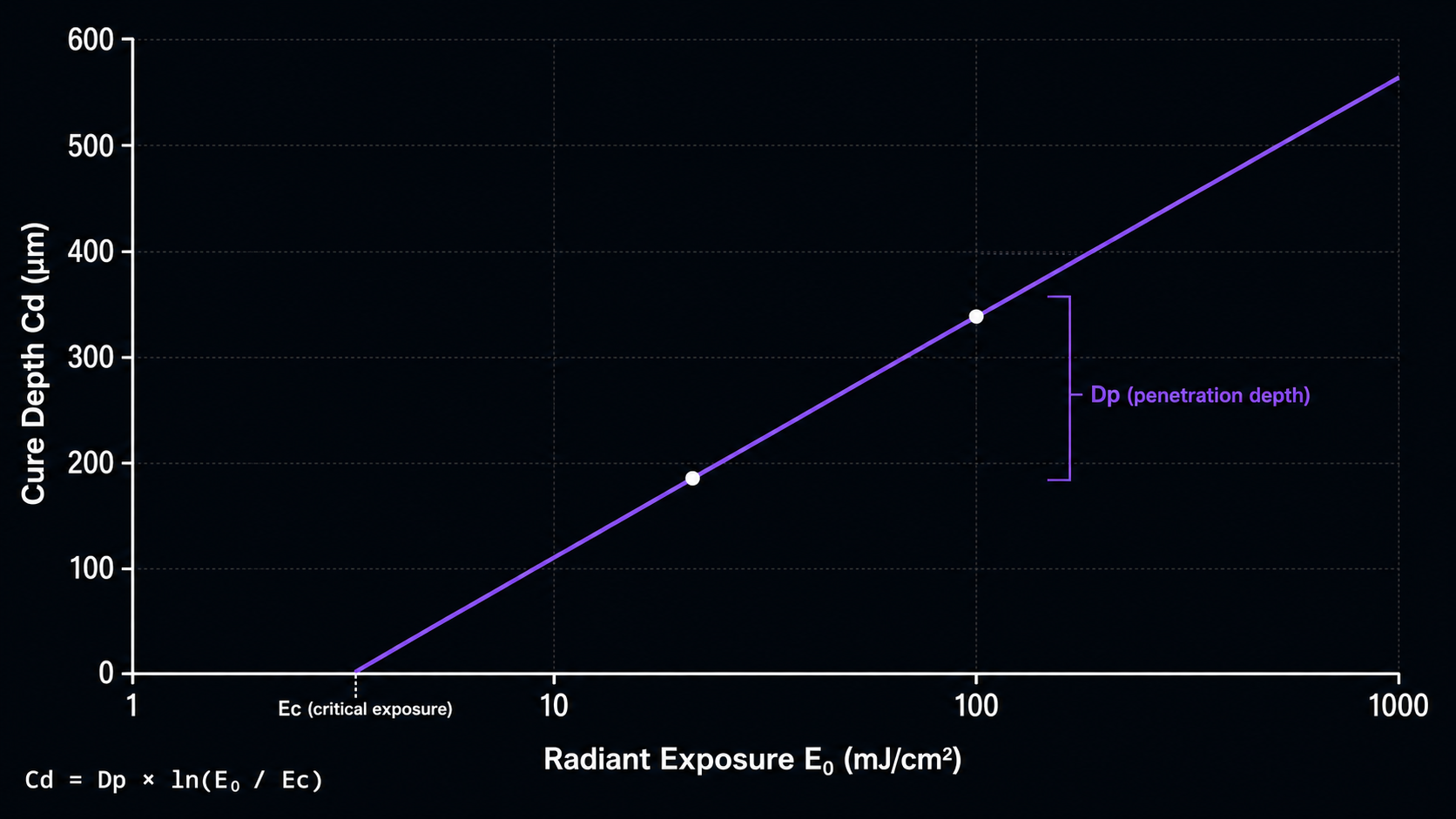 Ce que cette équation vous dit concrètement : si vous doublez votre énergie (en augmentant le temps d'exposition ou la puissance UV), vous n'obtenez pas deux fois plus de profondeur. Vous en obtenez un peu plus, selon un logarithme. C'est pour ça que passer de 2 à 4 secondes n'a pas le même effet que passer de 6 à 8 secondes.